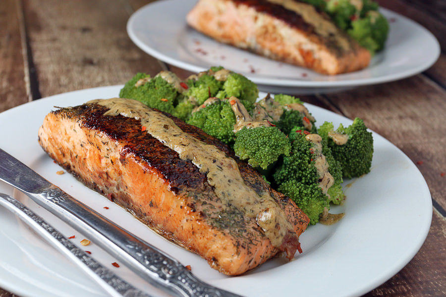 Remove salmon from the pan and set aside. Add butter and spices to the pan and let brown. Once browned, add cream mix together. Serve sauce on top of salmon.
