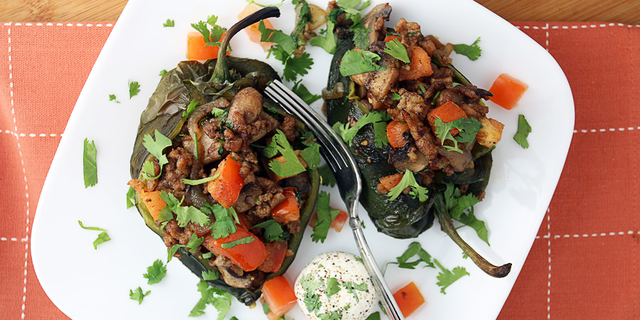 Spoon pork mixture into poblanos and bake at 350 for 8 minutes.