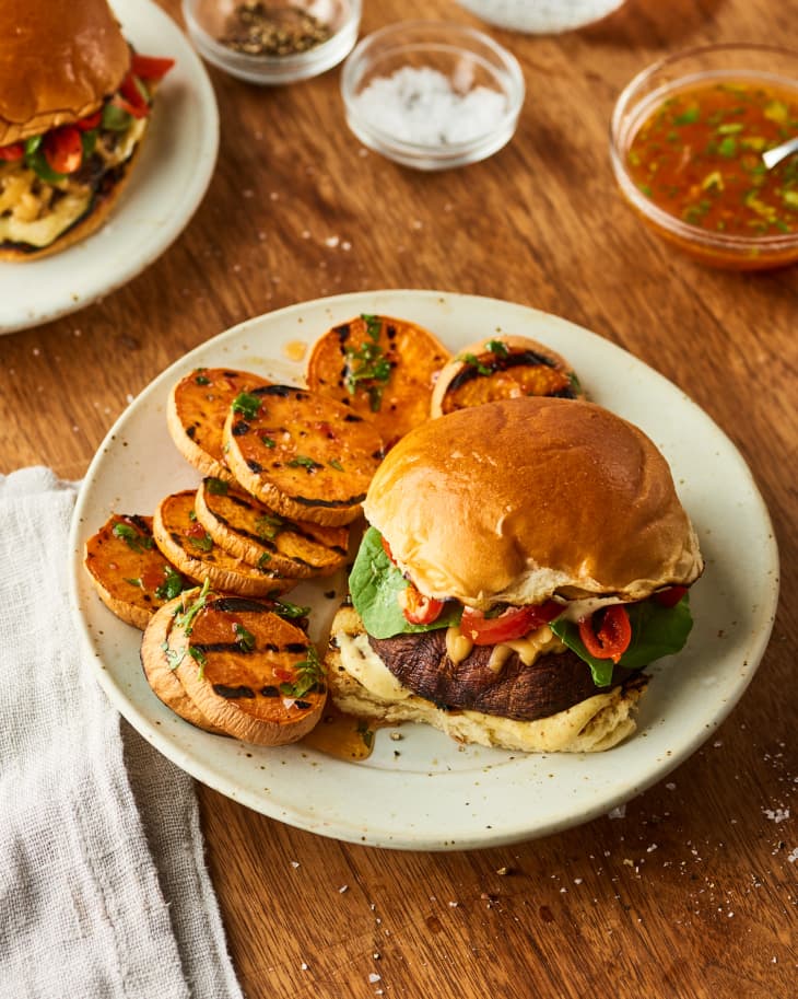 No-grill option: You can also bake the mushrooms instead of grilling them: Heat the oven to 425°F. Place the oiled and seasoned mushrooms on a rimmed baking sheet stem-side down and roast until just tender, about 15 minutes. Flip them, fill the caps with the Gouda, and continue to bake until the cheese is melted, 2 to 3 minutes. Toast the buns in the oven.