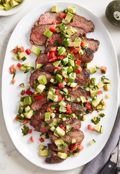 When the tri-tip is ready, transfer to a clean cutting board and let rest 10 minutes (tent loosely with aluminum foil if the kitchen is cold). Meanwhile, halve, pit, peel, and dice 1 ripe but firm large California Avocado (about 1 cup). Add to the relish and gently fold to combine. Taste and season with more kosher salt as needed.