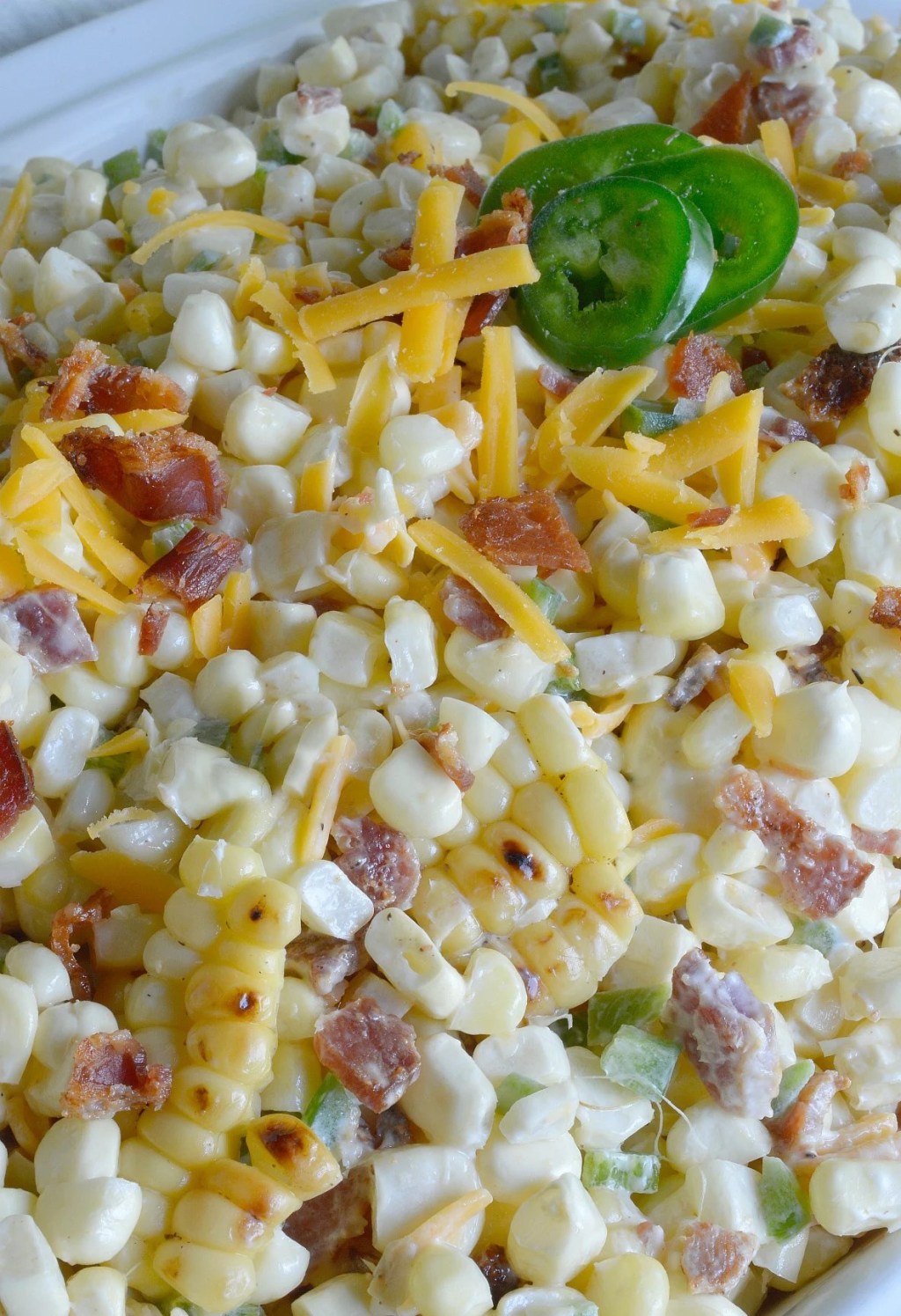 Mix kernels with chopped jalapeños, bacon pieces, cream cheese and sour cream. Stir.